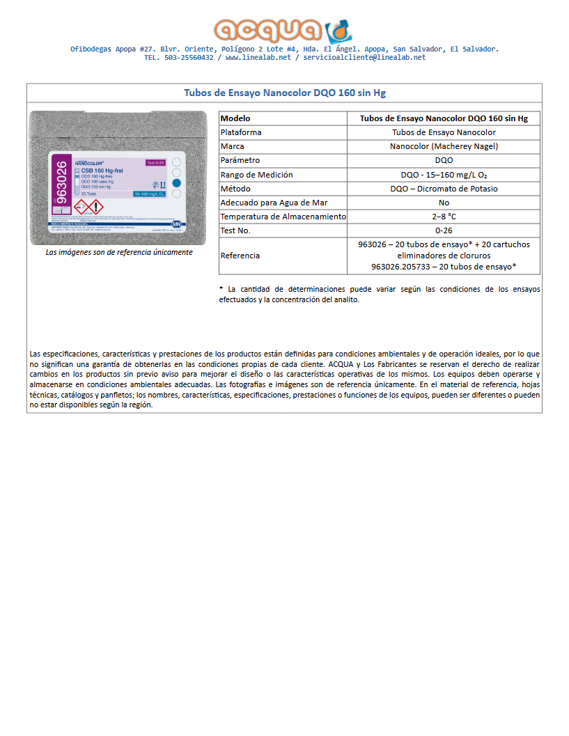 Tubos de Ensayo Nanocolor DQO 160 SHG. Max. 20 Test. No Incluye Cartuchos para Cloruros.
