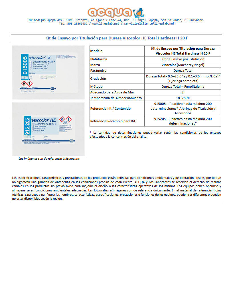 Kit de Ensayo por Titulación para Dureza Visocolor HE Total Hardness H 20 F. Max. 200 Determinaciones.